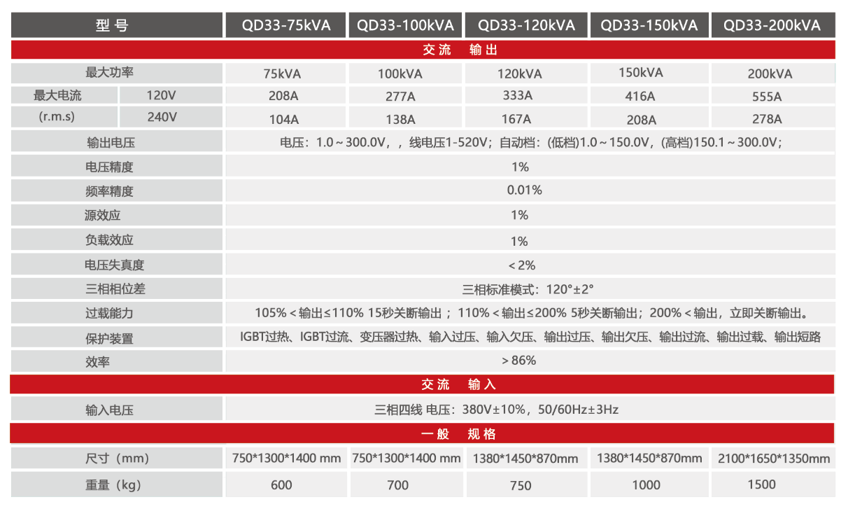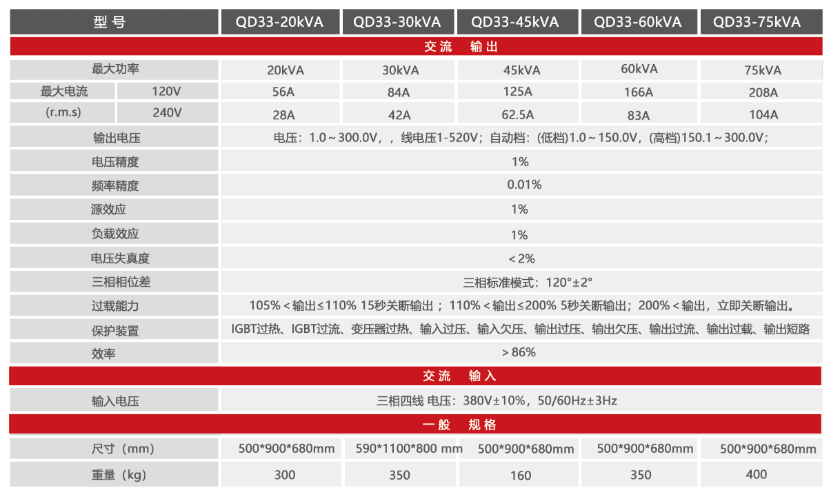 QD33系列變頻電源是我公司采用國際先進的SPWM(正弦脈寬調制)技術研制而成,可支持功率在三相6000KVA以內的任意產品定制。具有負載適應性強、輸出波形品質好、操作簡便、體積小、重量輕等特點,具有短路、過流、過載、過熱等保護功能。